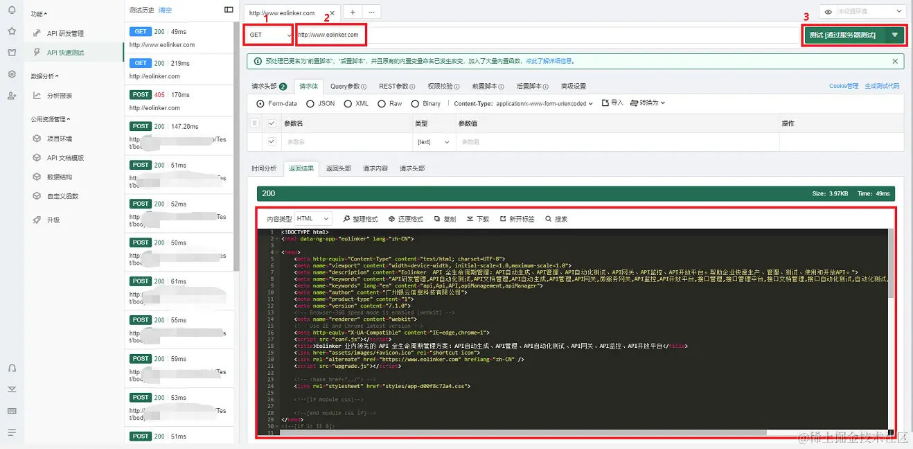 下述示例均使用eolinker工具进行api测试演示。 使用地址:www.eolinker.com