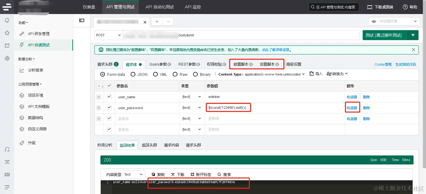 你也可以对数据进行处理,比如做md5加密。eolinker提供方便的构造器功能,可快速处理数据。也可以编写前后置脚本,对数据进行复杂的处理。
