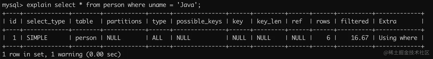 explain select * from person where uname = 'Java';