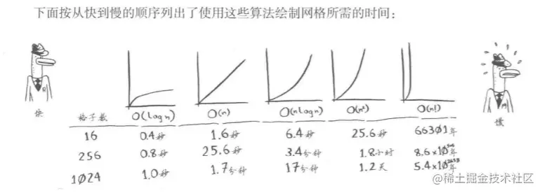 大O表示法指出了算法的速度有多快,像上述的例子当中假设每检查一次元素需要1毫秒,被检查的目标元素位于300,用普通遍历查找的方式需要查找300次才能得到结果,也就是需要300毫秒,二分查找的方式需要9次,也就是9毫秒。普通的遍历方法查找的运行时间为O(n),用二分查找的方法运行时间为O(log n)。当然了,大O表示法只是描述了算法运行时间的增速,还是一样的例子假设将目标人物定位1,用O(n),只需要执行一次就能找到了,但是他的运行时间也总是O(n),因为大O表示法说的是最糟糕的情形,所以在最糟糕的情况下,需要查找数组中的每一项,对应的运行时间就是O(n)。