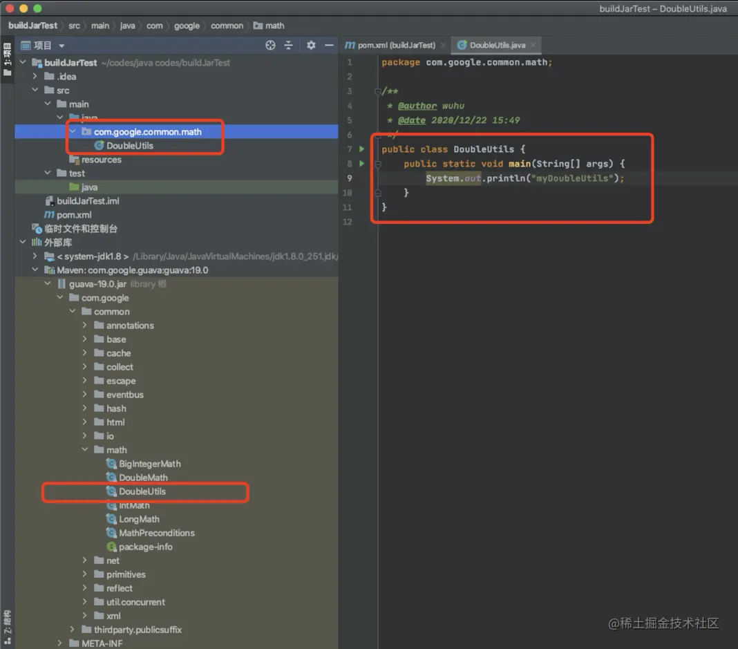 可以发现,在这个项目中我引入了一个 google guava 依赖,并且创建了一个 package、类名都与 guava 中