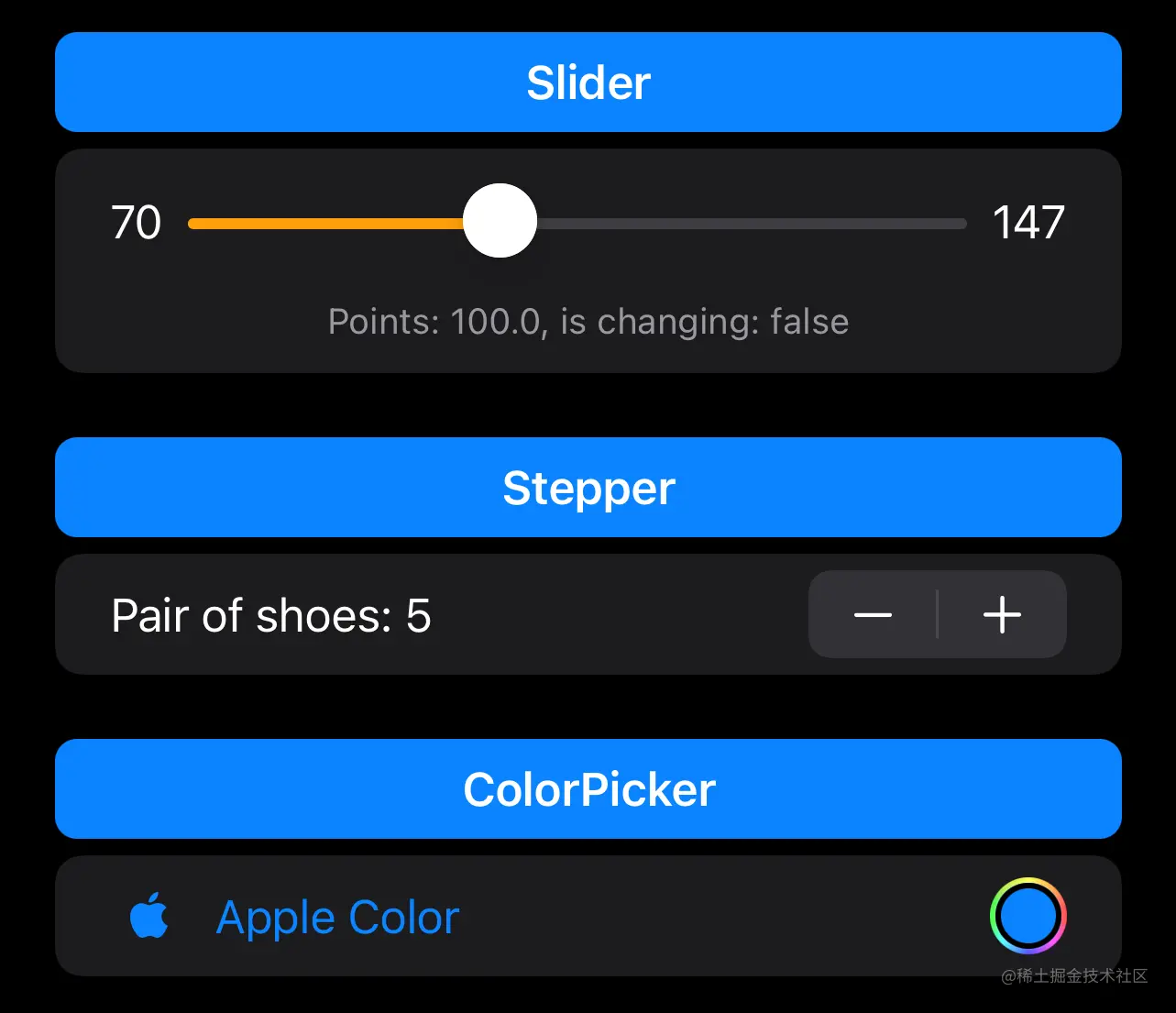 Toggle 可以直接传入字符串构建,也可以自定义样式,如示例所示,Cold 对应的开关,我们传入的是一个 Label 。并且通过 if isCold { Image... } 条件渲染左边的天气图标。
