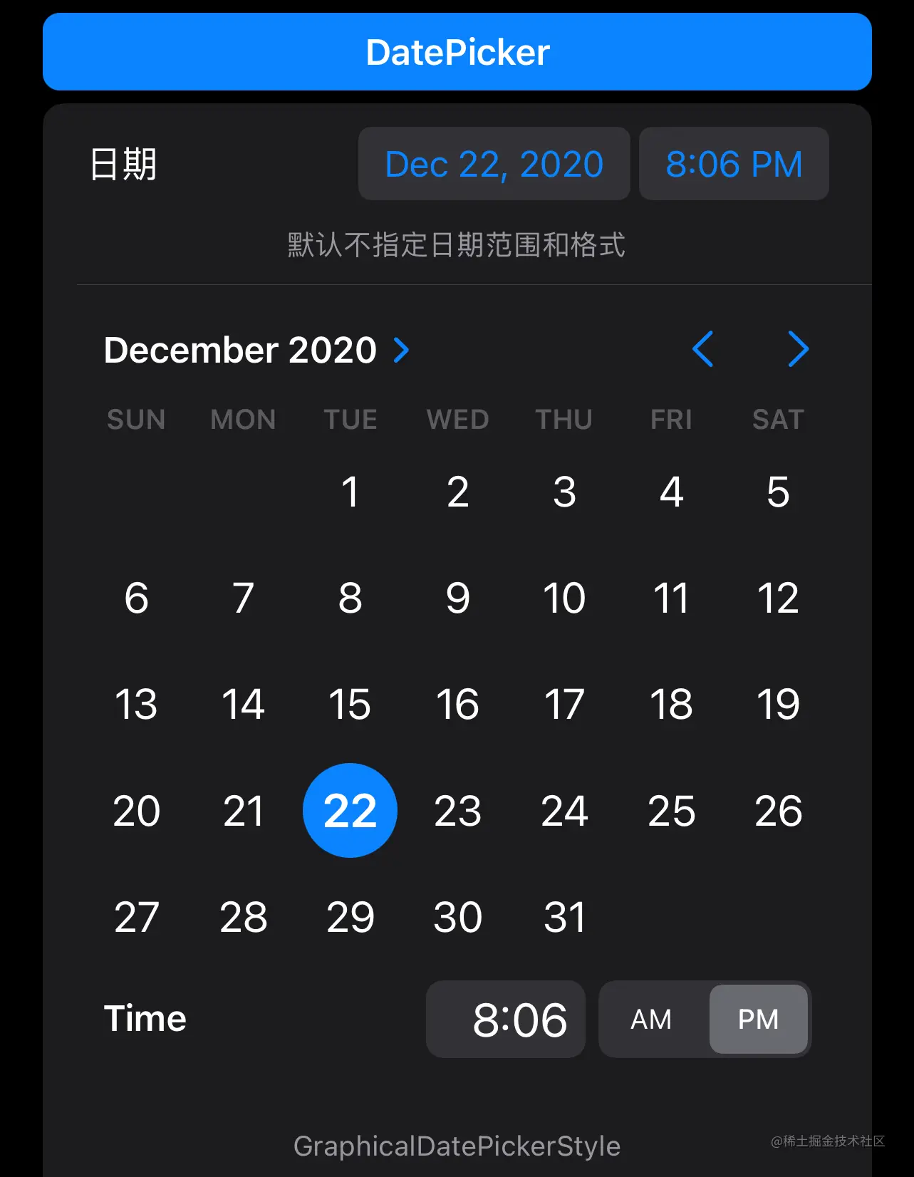 displayedComponents: .date 表示展示样式是日期,我们可以指定其为 .hourAndMinute ,或者同时指定两者(默认就是如此)。