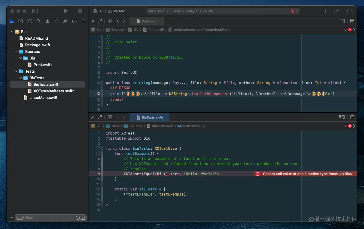 创建完成后,在 Sources 文件下添加代码,然后按 cmd + B 编译。如果发现编译器报错,是因为测试代码有误。如果我们不需要编写测试代码,注释即可。