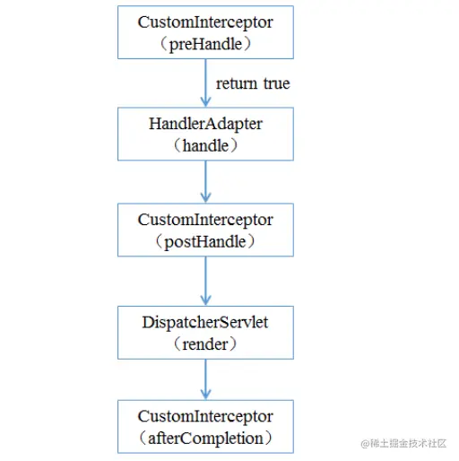 protected void doDispatch(HttpServletRequest request, HttpServletResponse response) throws Exception { ..... // Determine handler adapter for the current request. HandlerAdapter ha = getHandlerAdapter(mappedHandler.getHandler()); ..... //preHandle if (!mappedHandler.applyPreHandle(processedRequest, response)) { return; } // Actually invoke the handler. mv = ha.handle(processedRequest, response, mappedHandler.getHandler()); if (asyncManager.isConcurrentHandlingStarted()) { return; } applyDefaultViewName(processedRequest, mv); //PostHandle mappedHandler.applyPostHandle(processedRequest, response, mv); } catch (Exception ex) { dispatchException = ex; } ........ // 该方法中调用triggerAfterCompletion processDispatchResult(processedRequest, response, mappedHandler, mv, dispatchException); }在运行程序时,拦截器的执⾏是有⼀定顺序的,该顺序与配置⽂件中所定义的拦截器的顺序相关。 单个 拦截器,在程序中的执⾏流程如下图所示: