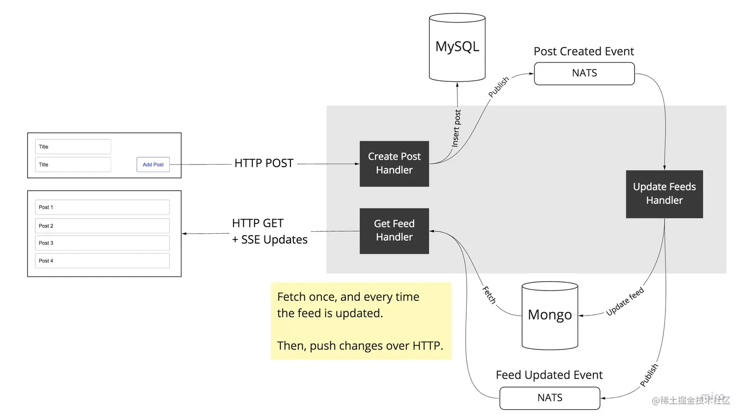 - 所有的帖子都存储在 MySQL 中。这就是写模型。