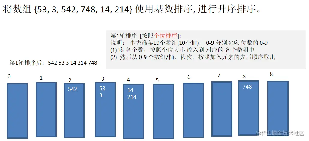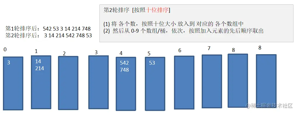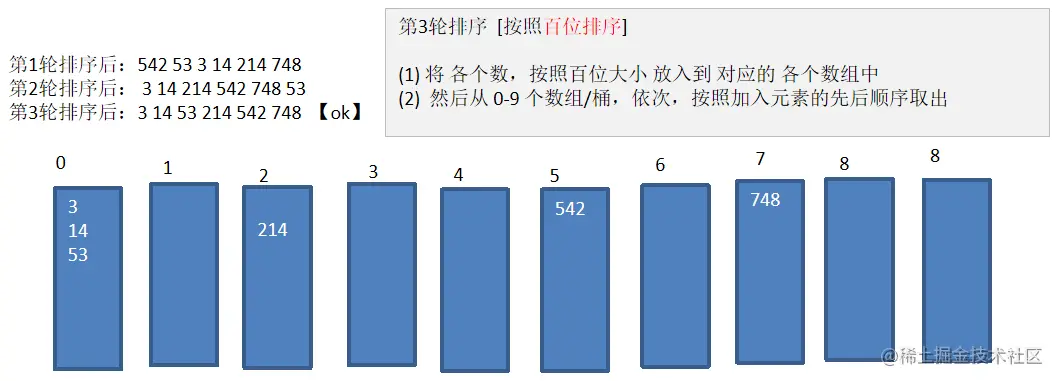 public static void radixAsc(int[] array) { //定义 10 个桶 int[][] bucket = new int[10][array.length]; //10 个桶内元素下一个位置的索引,或者说是桶内元素个数 int[] bucketSize = new int[10]; for (int div = 1; ; div *= 10) { boolean zeroFlag = true;//是否所有元素除以 div 后都等于 0 for (int i = 0; i < array.length; i++) { int d = array[i] / div; if (d > 0) { zeroFlag = false; } int mod = d % 10; bucket[mod][bucketSize[mod]++] = array[i];//放入桶的对应位置 } if (zeroFlag) {//都等于 0,则说明排序完毕 break; } int index = 0; //将桶中元素放回数组,一次排序完毕 for (int i = 0; i < bucketSize.length; i++) { for (int j = 0; j < bucketSize[i]; j++) { array[index++] = bucket[i][j]; } //注意需要将桶内元素个数清 0 bucketSize[i] = 0; } } }