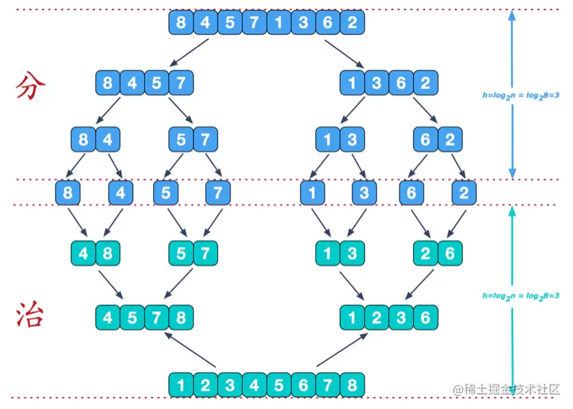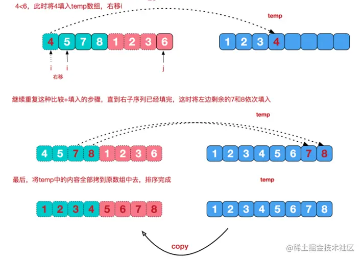 再来看看治阶段,我们需要将两个已经有序的子序列合并成一个有序序列,比如上图中的最后一次合并,要将[4,5,7,8]和[1,2,3,6]两个已经有序的子序列,合并为最终序列[1,2,3,4,5,6,7,8],来看下实现步骤。