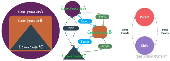 通过 props 传递父组件数据和事件,或者通过 $emit 和 $on 实现事件传递