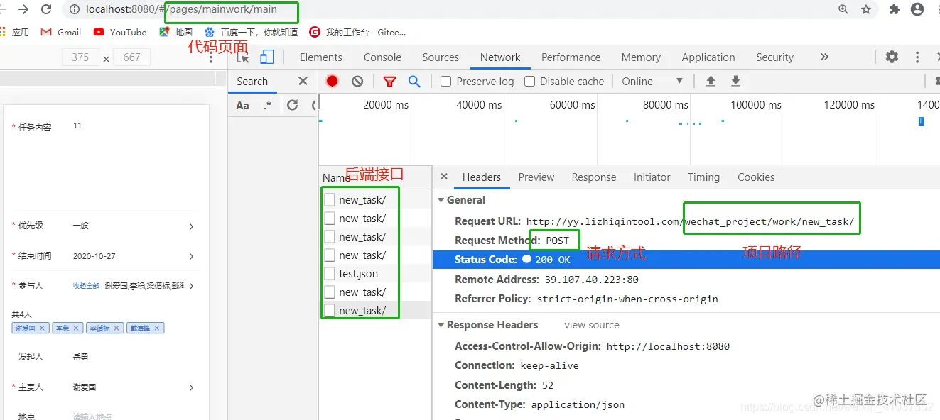 运行需要修改接口参数的页面。并按 F12 进入调试状态,点击 network, 查看请求头信息。找到要(增删改查)的接口参数,顺便看一下请求方法(post/get), 看一下请求地址。