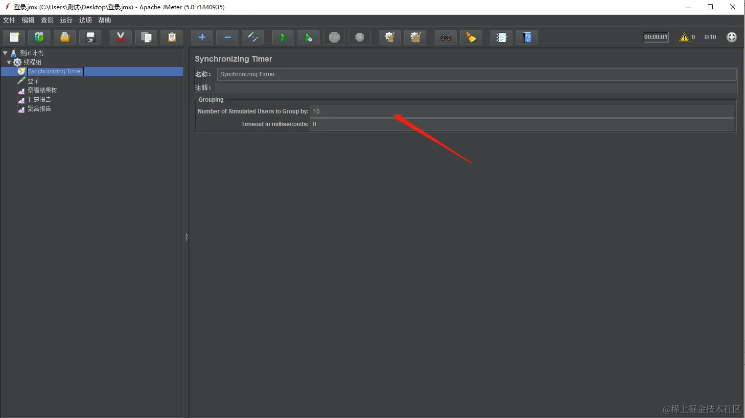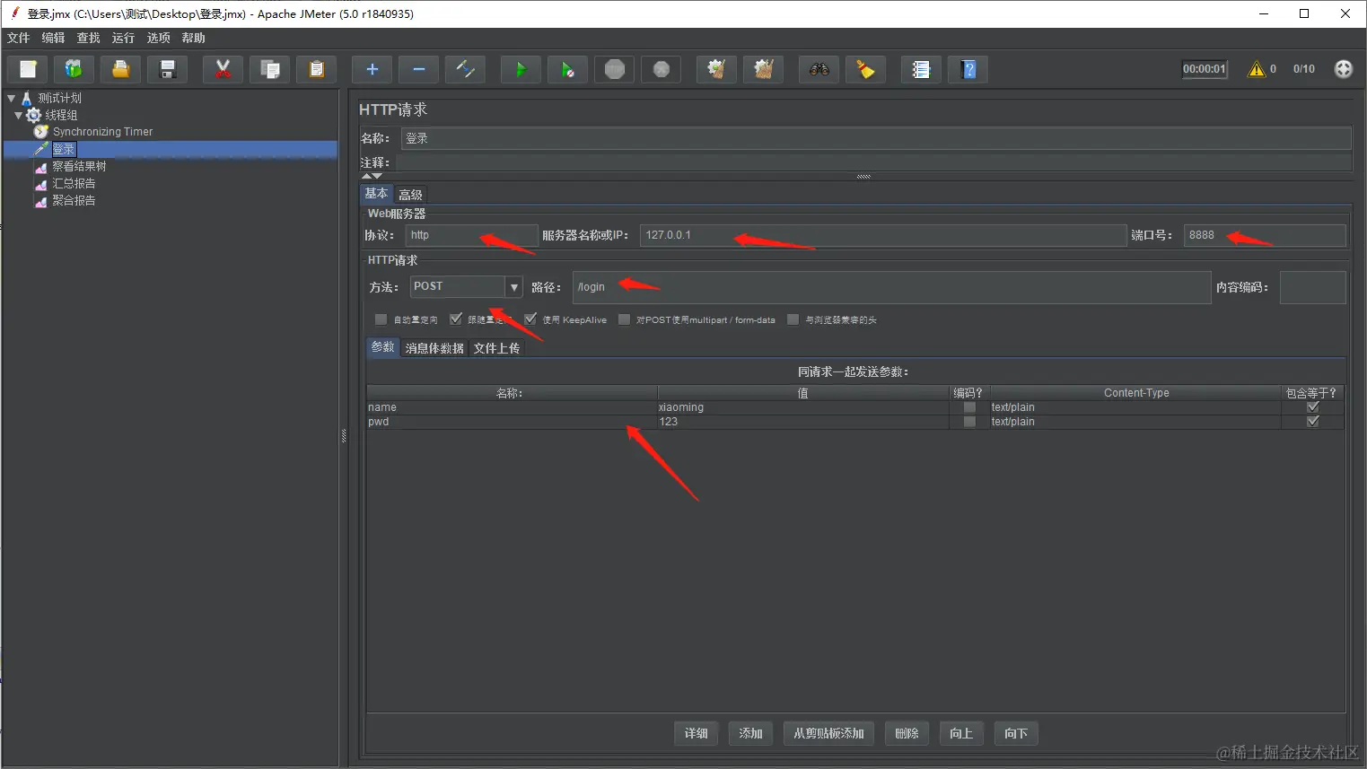 打开jmeter,设置线程组,集合点、请求、查看结果树、汇总报告、聚合报告等,可根据自己的需求进行添加