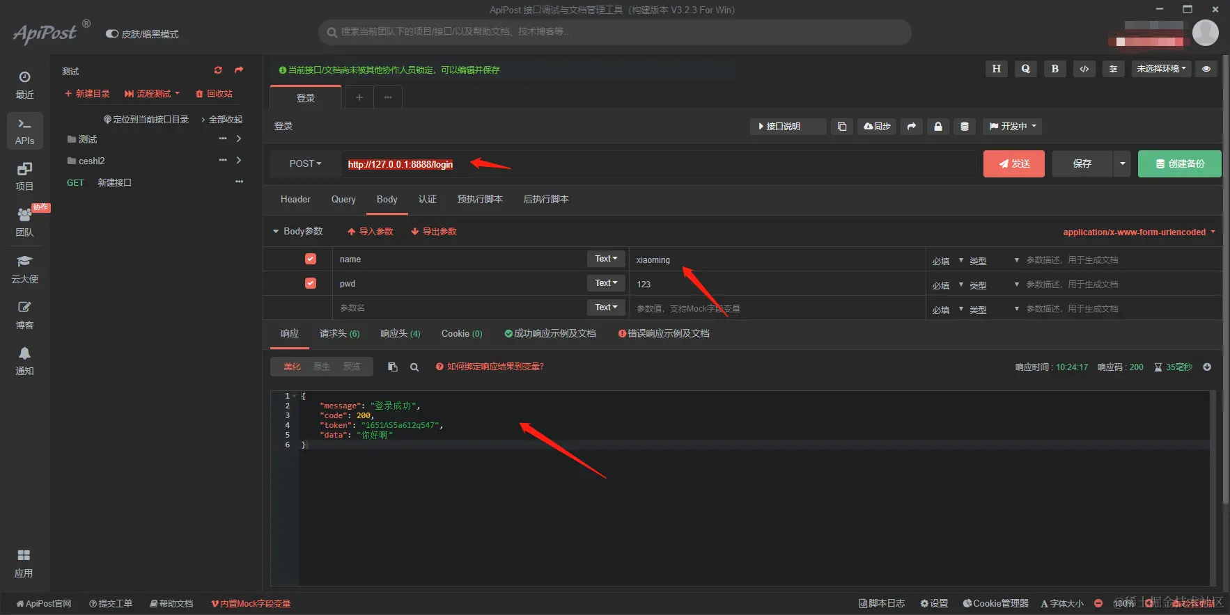 使用工具进行接口测试,这里我用的是国产的接口测试工具apipost,它还支持接口文档的生成。