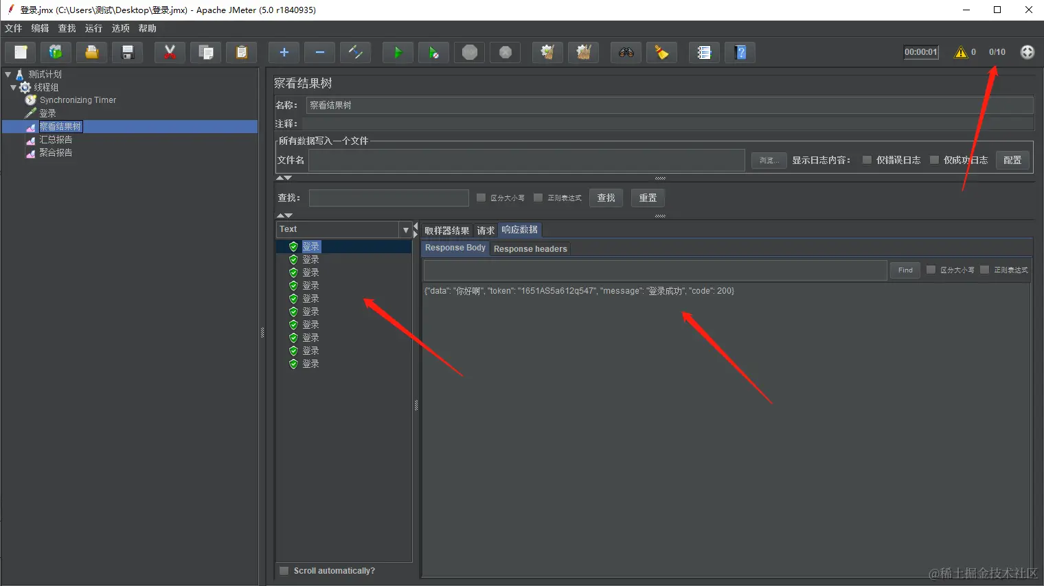 这里对一个接口并发十次,但是真正意义的登录性能测试,是多个用户进行登录。这里条件限制就用一个接口进行登录的并发测试。