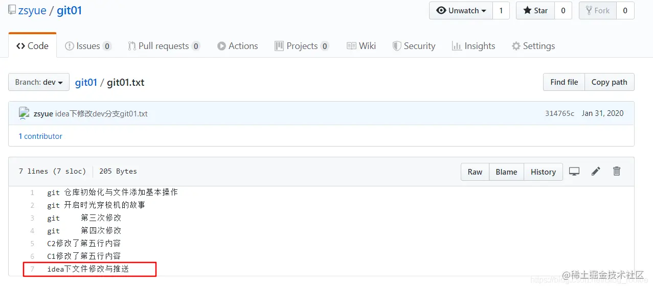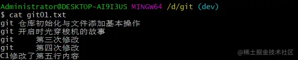 c1 客户端本地修改dev 分支git01.txt 文件并在本地执行提交操作 效果如下