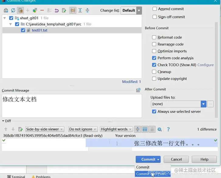 修改git01.txt 文件后执行添加并提交 此时未受版本控制的文件列表已消失 执行提交即可(也可以提交同时进行推送一步到位!)。
