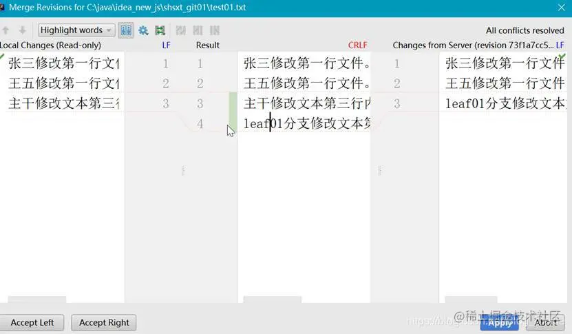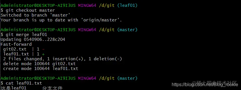 开发中对不同分支下同一文件进行修改后执行合并时就会出现文件修改冲突情况,这里说明一种比较常见的冲突问题 以master 和leaf01 两个分支进行演示说明。
