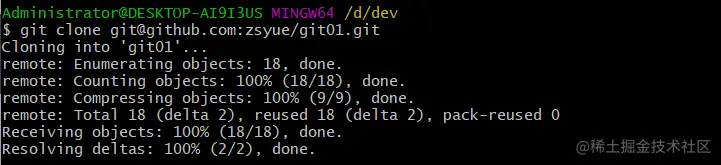 拉取远程库dev 并在本地创建dev开发库,执行命令 git checkout -b dev origin/dev 这里以同台机器不同窗口来模拟两个用户操作同一分支同一文件(实际开发时多人操作统一文件冲突情况比较常见)