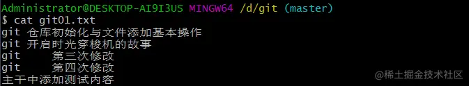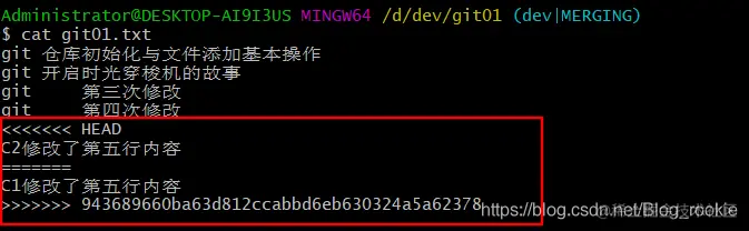 此时出现冲突后 这里对git01.txt 内容进行修改 (实际开发视情况而定 这里将内容合并为一行)