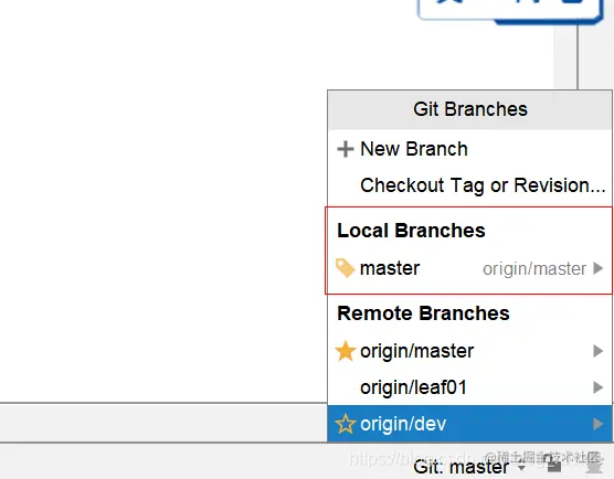 检出远程库dev 分支到本地 这里可以使用前面的命令 git checkout -b local_branch origin/remote_branch 或者使用图形化界面进行操作 这里介绍第二种 图形化操作 在idea 右下角拉取远程dev 到本地
