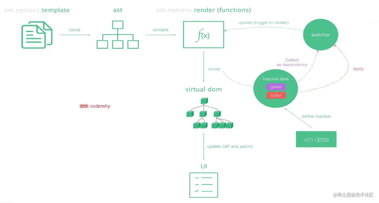 runtime-compiler: template——> ast ——> render ——> vdom ——> UI