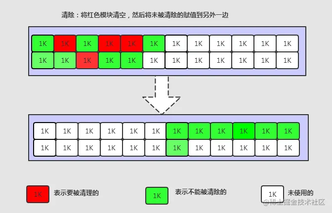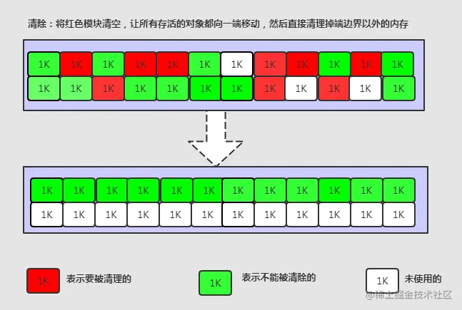 刚刚新建的对象在Eden中,一旦Eden满了,触发一次Minor GC,Eden中的存活对象就会被移动到Survivor区。这样继续循 环下去,下一次Eden满了的时候,问题来了,此时进行Minor GC,Eden和Survivor各有一些存活对象,如果此时把Eden区的 存活对象硬放到Survivor区,很明显这两部分对象所占有的内存是不连续的,也就导致了内存碎片化。