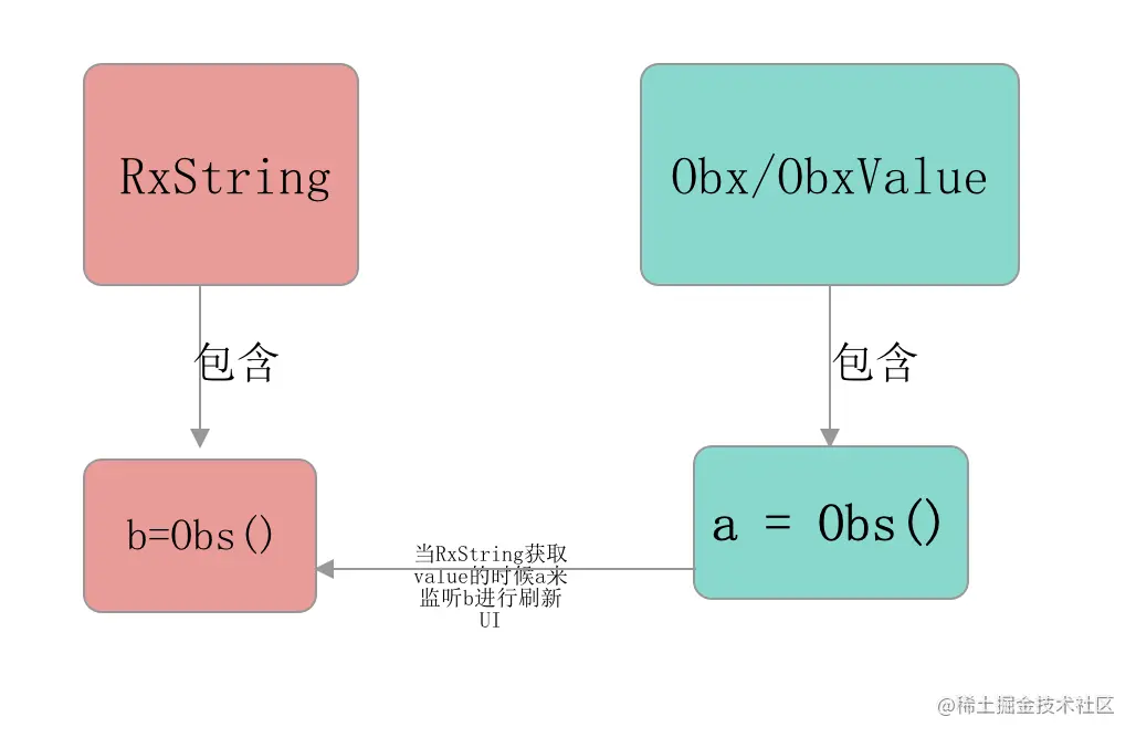 继承_RxImpl的子类,在获取value的时候把自己的流的监听给了getObs,现在的全局变量getObs是Obx()的,千言万语不如一张图: