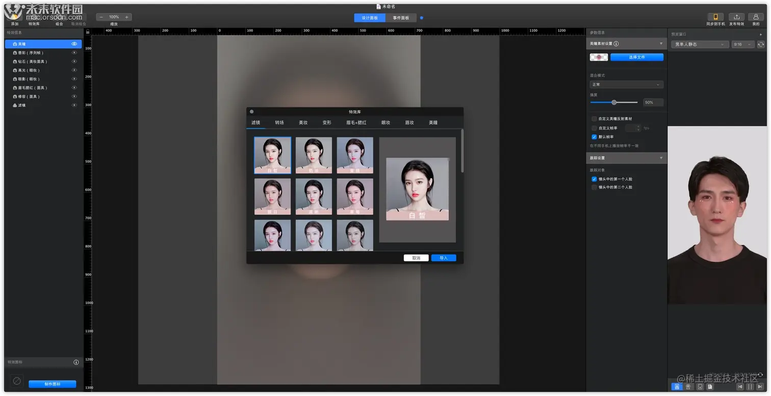 将你制作的特效实时展示出来,也支持调用电脑摄像头查看效果。