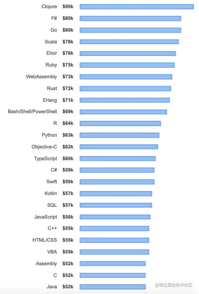 薪酬也是反映编程语言是否受欢迎的指标之一,同样根据 Stack Overflow 2019 年度开发者调查报告的数据显示,在哪种编程语言能够获得较高薪酬的排名中,Go 语言排名第三,而 Python 和 JavaScript 的排名就落后了很多。由此也反映出了 Go 语言的「钱途」。