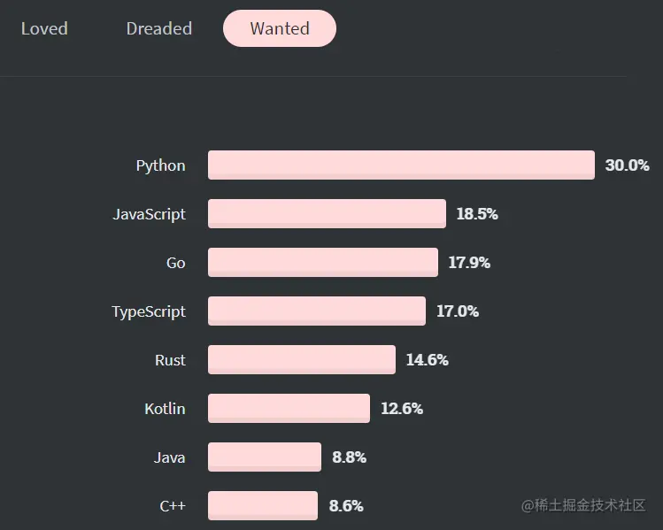 Stack Overflow 每年的开发者调查是全球规模最大、范围最全面的调查之一。2019 年的统计获得了全球近 9 万名开发者的数据。在最想使用编程语言的榜单中,Python 领先地位明显,JavaScript 和 Go 语言分列二三位。