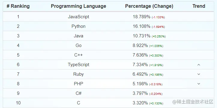 但观察每种编程语言的排名,我们可以看到 Go 的受欢迎程度正在显著提升,而 JavaScript 和 Python 的受欢迎程度正在下降。