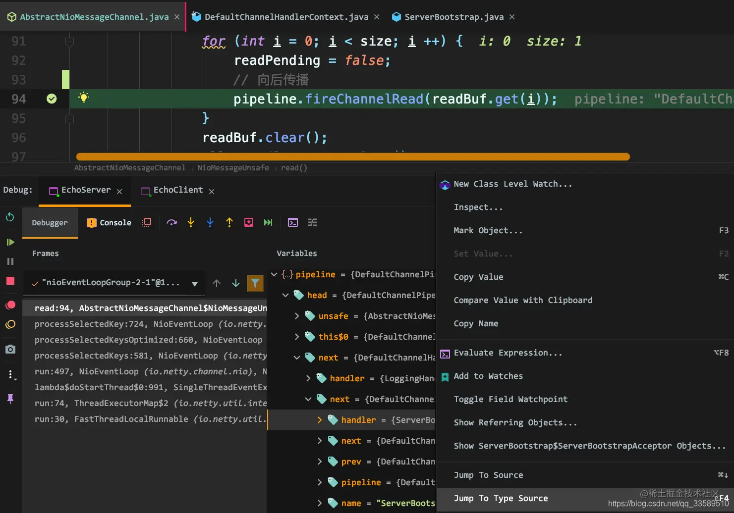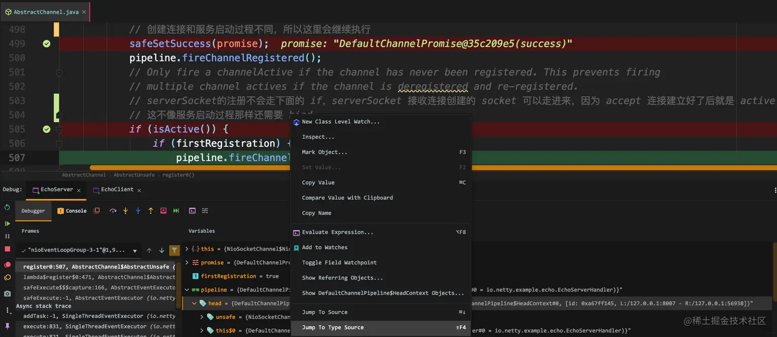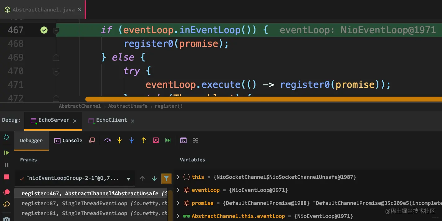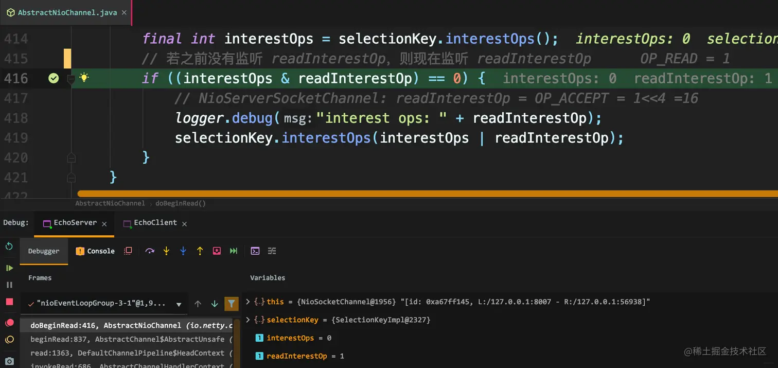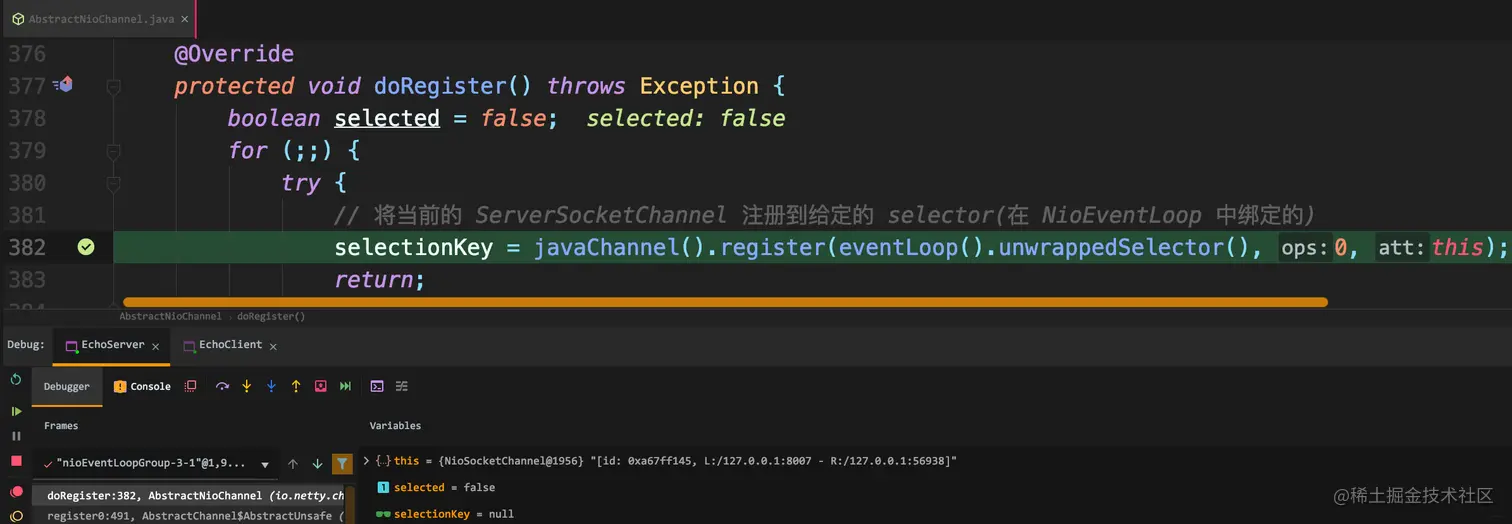 接收连接请求的处理本质是对 OP_ACCEPT 的处理,即在 NioEventLoop 中,因为注册到了NioEventLoop的 selector。 分别调试启动 EchoServer 和 EchoClient