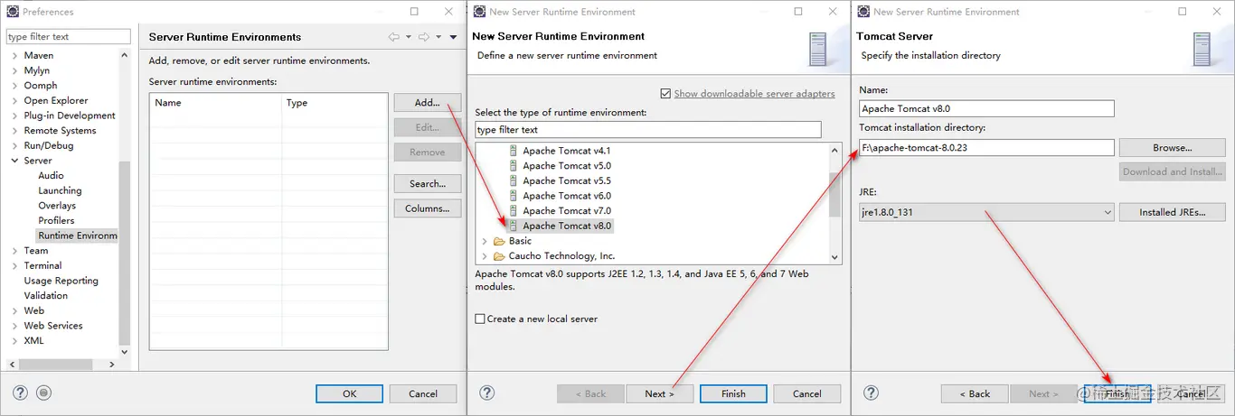 Window→preferences→Server→Runtime Environment→add→apache-tomcat-8.0.23