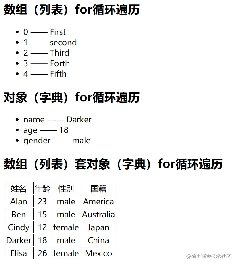 <h2>数组(列表)套对象(字典)for循环遍历</h2>