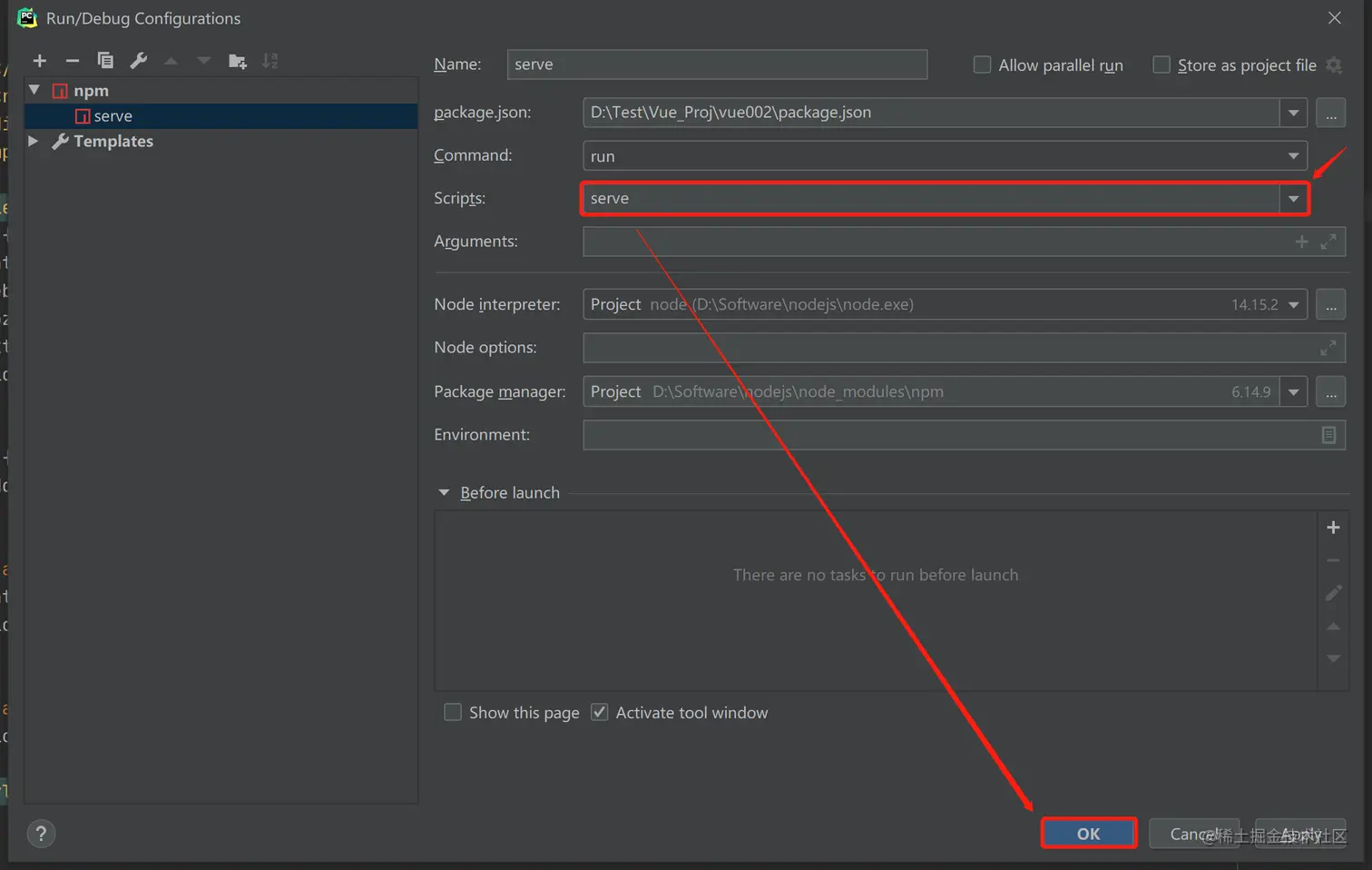 ④ Scripts下拉框选择serve - 点击:OK