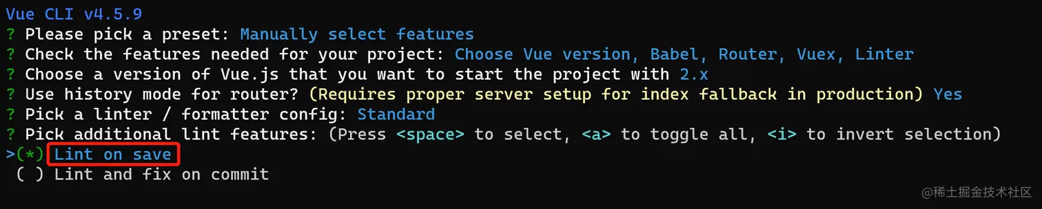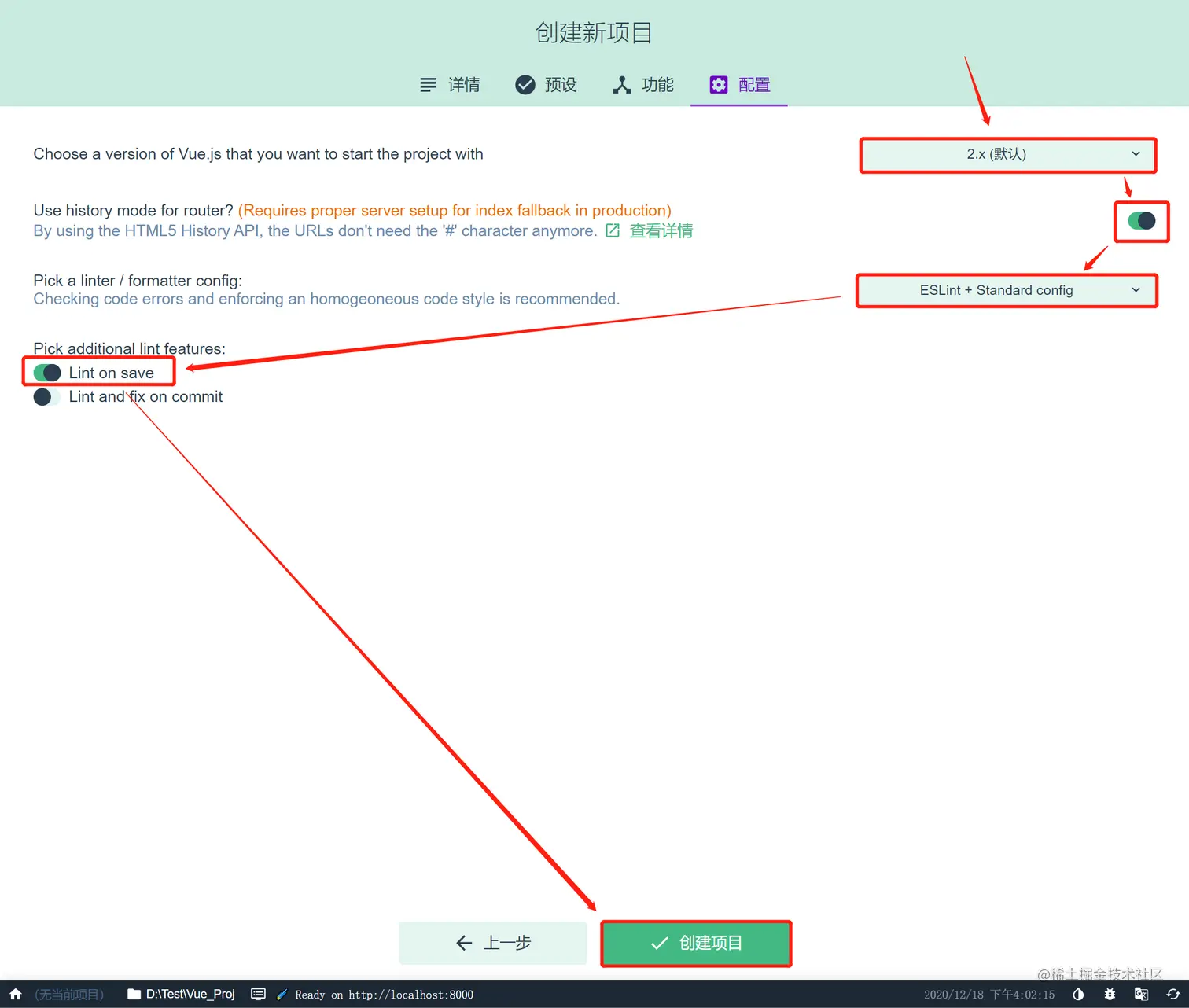 7.版本选择2.x- Use history... 勾选 - 选择ESLint + Standard config - Lint on save勾选 - 创建项目
