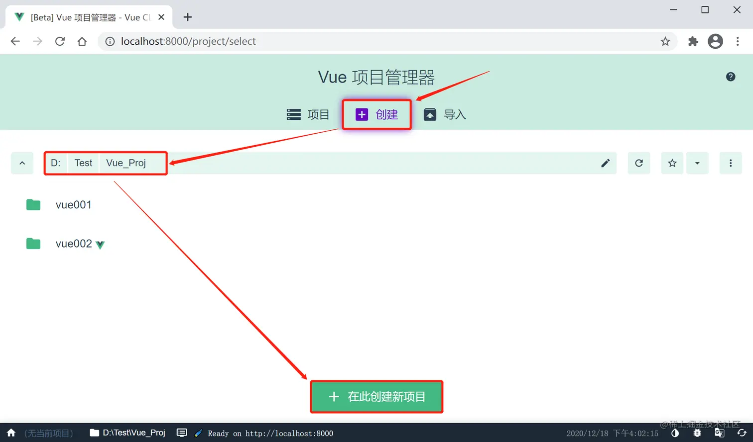3.点击:创建 - 选择路径 - 点击:在此创建新项目