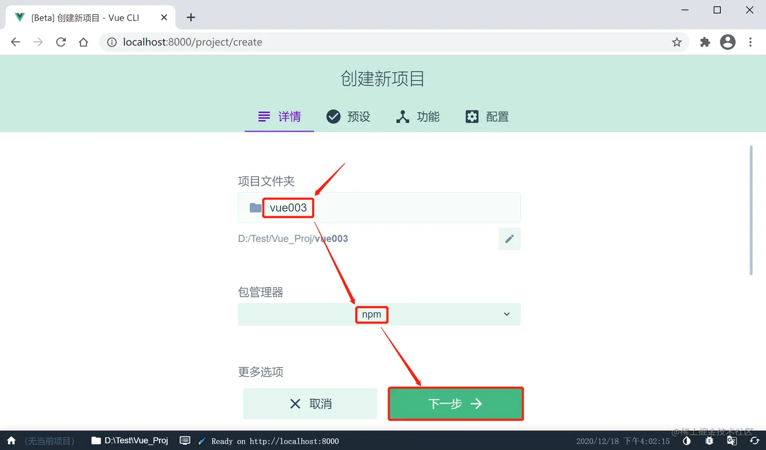 4.项目文件夹:自定义项目名称 - 包管理器:npm - 点击:下一步