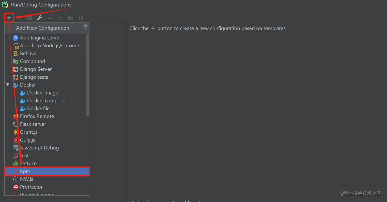 ③ 点击左上角+ - 点击:npm
