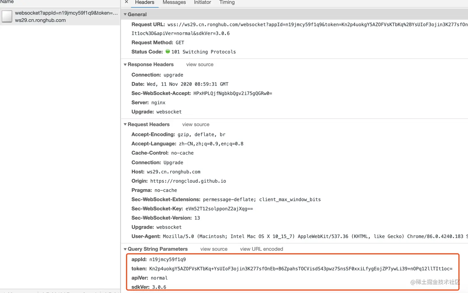 通过抓包可知, 融云链接 websocket 时还带了 appkey、token、SDK 版本信息