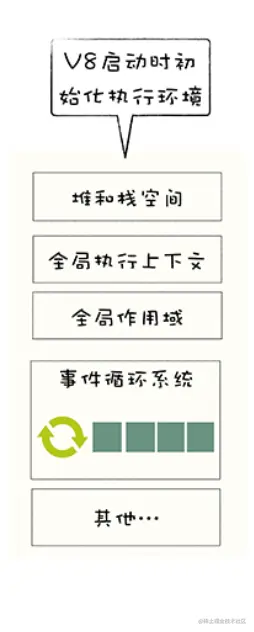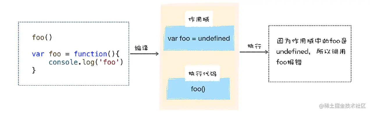 对变量提升理解 张凯宇 2020-12-23 330 阅读1分钟 v8引擎编译一段js代码之前会创建一个环境 环境中包括 这里有一个叫全局作用域 编译阶段会把全局环境中的变量。以及函数表达式,函数声明 ,按照第一个图那样处理。 也就是所有的变量都放到了作用域中,当具体执行的时候去作用域当中找就行了,所以你可以提前使用。 但是,只不过对于变量跟函数表达式 默认赋值为undefined,函数声明默认赋值函数体。