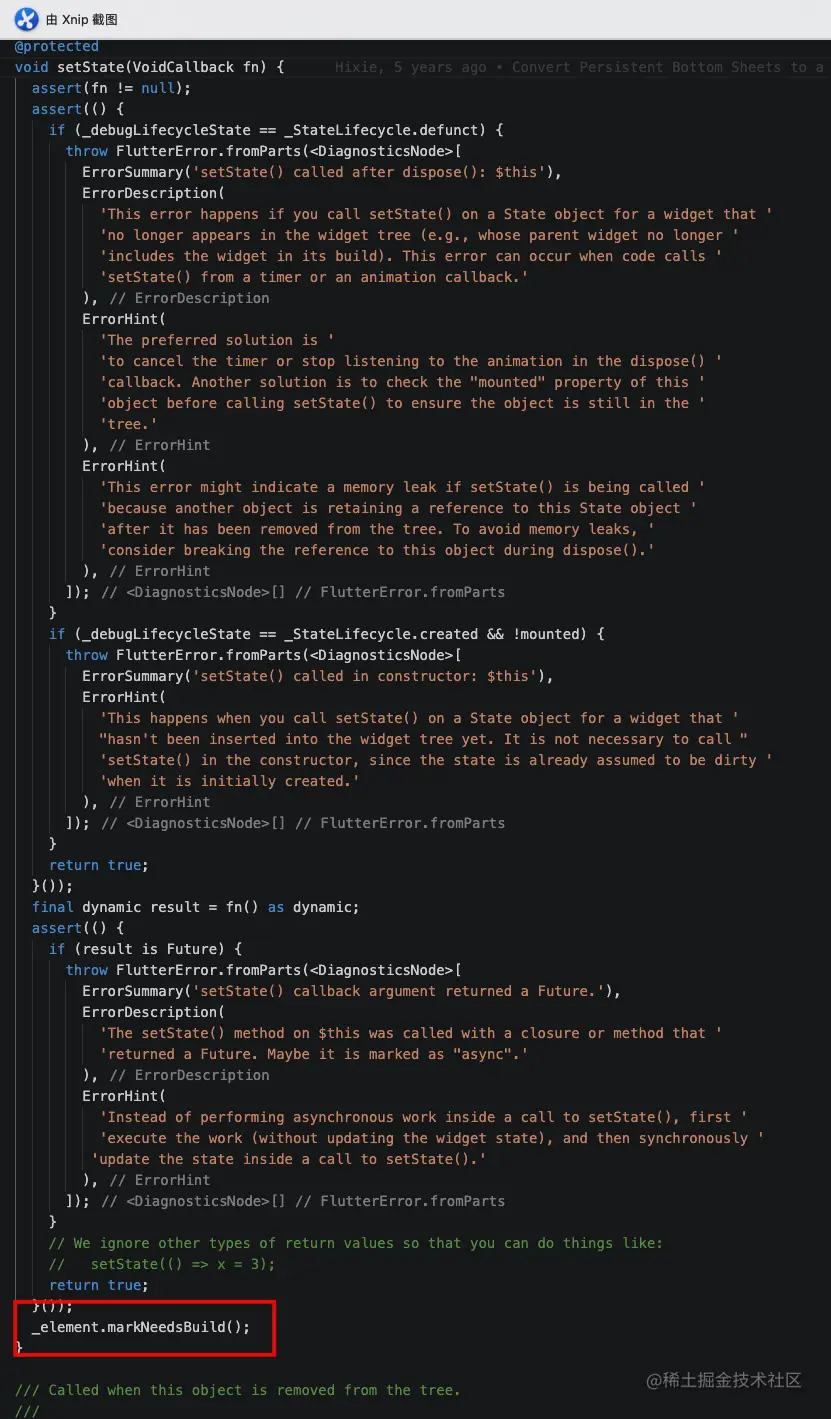 可以看出setState方法其实是调用了markNeedsBuild()方法,而markNeedsBuild()方法内部会标记element为dirty,然后在下一帧会重新绘制,所以setState并不是立刻生效的。