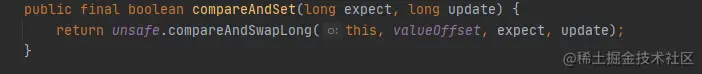 return UNSAFE.compareAndSwapLong(this, valueOffset, cmp, val);