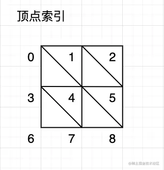 整体思路是:一个矩形可以分成两个三角形,一个三角形包含3个索引,可占数组的3位。 则最终对于上图的顶点索引可以为