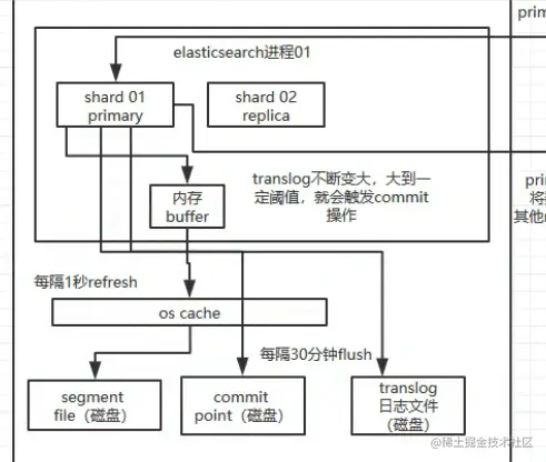 translog每30分钟或者到达一定的量就执行commit操作(flush操作)。1、写commit point;2、将os cache数据强刷到磁盘 3、清空translog日志, 同时translog每5秒持久化一次
