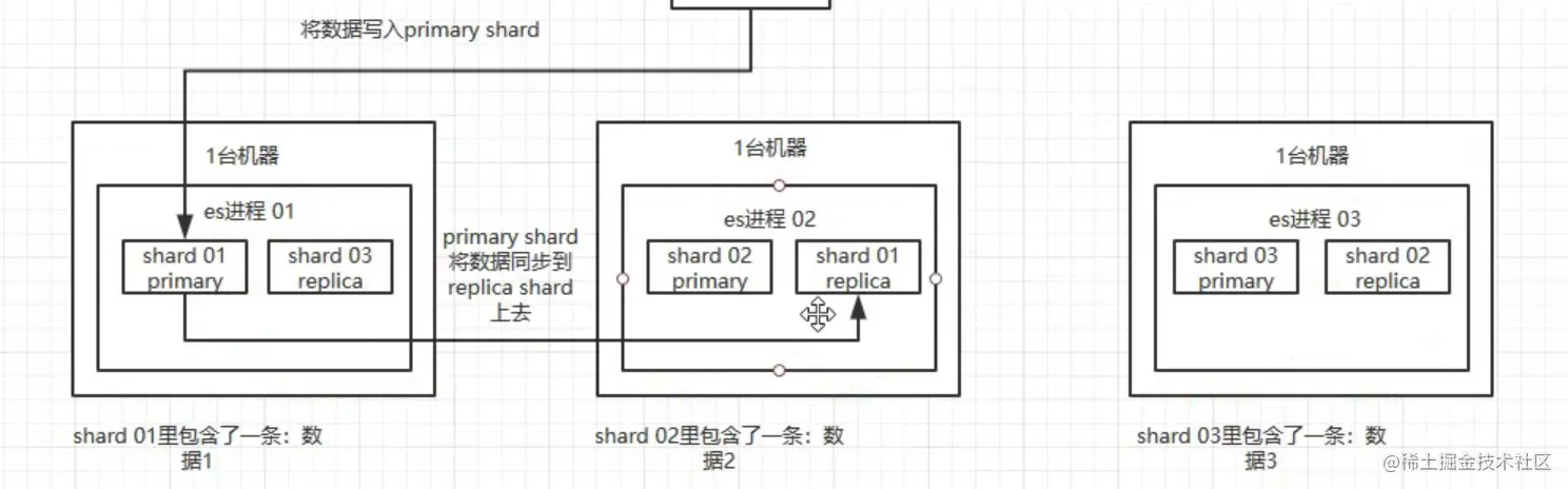 1、数据会分布到不同的服务进程,每个服务进程都会分配一个primary sharp和replicashard