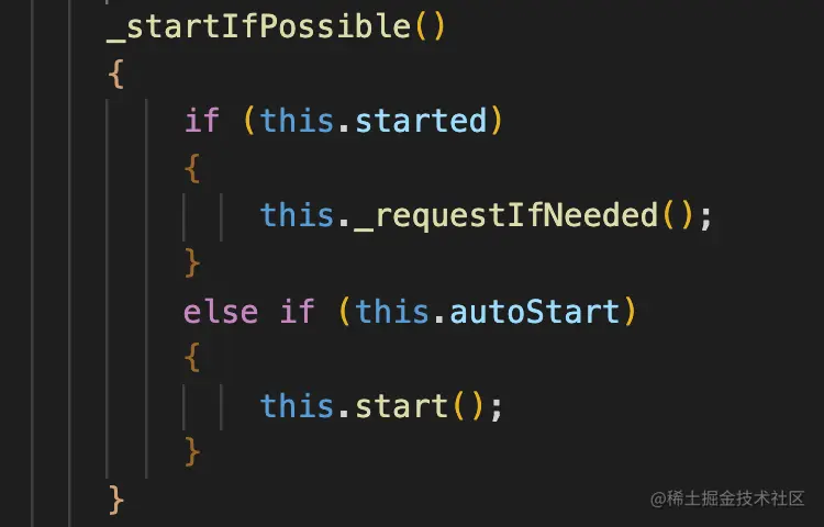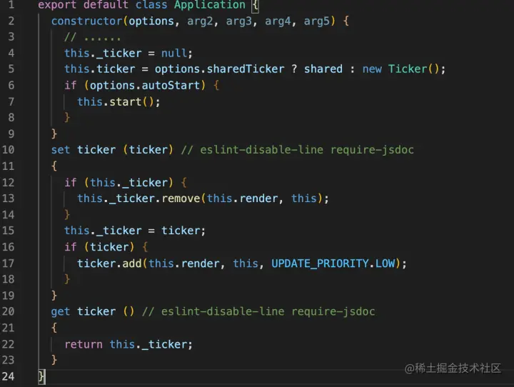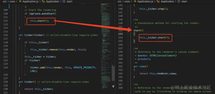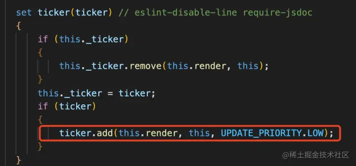 通过set方法,我们知道,对ticker赋值其实是更新了this._ticker(用新值覆盖了前一次的this._ticker)。而start方法也是执行了this._ticker.start。