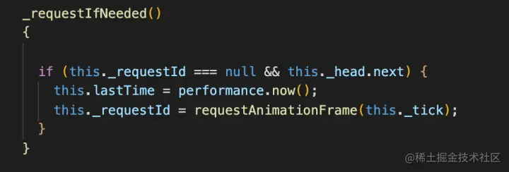 因为每次执行完_tick后this._requestId = requestAnimationFrame(this._tick);所以_requestIfNeeded的条件语句不会执行。