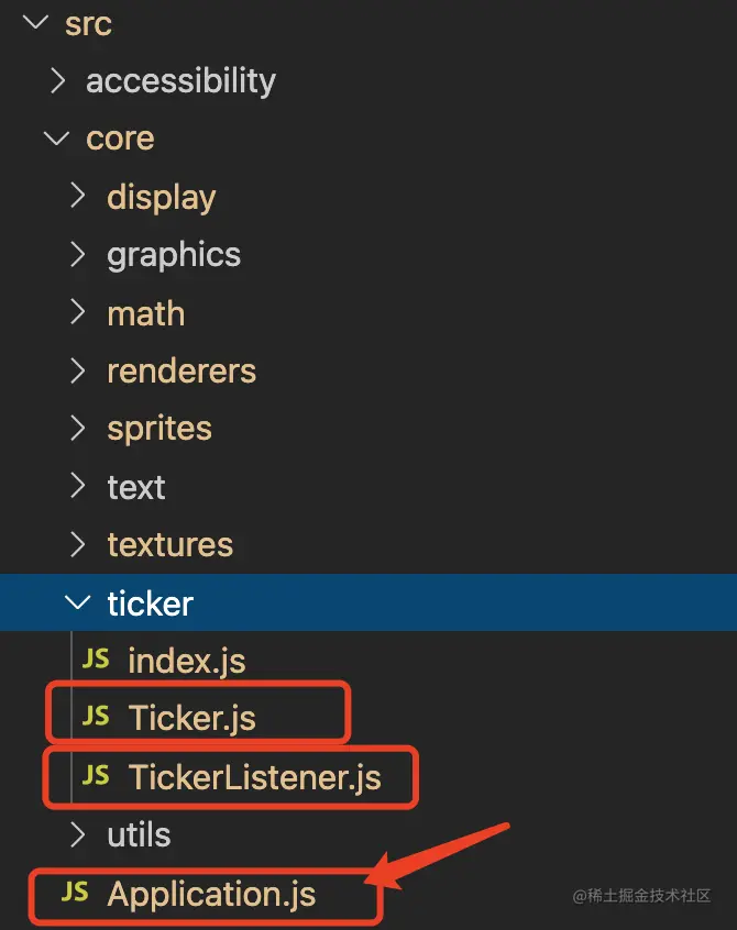 core文件夹是用来存放核心代码的,比如diaplay中存放处理显示盒的代码,sprites中是处理精灵图的代码,renderer中存放处理渲染的代码。这些我们日后都会说到。上一节我们说的new Application()的逻辑代码就来源于core根目录的Application.js。