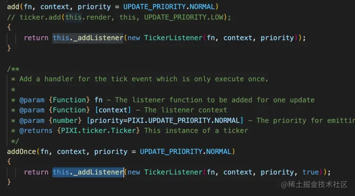 这里通过next遍历回调函数链来执行emit方法。这些逻辑都被写在TickerListener中,不过在进入TickerListener之前我们还需要弄懂add和remove函数逻辑以及UPDATE_PRIORITY.LOW的意义。