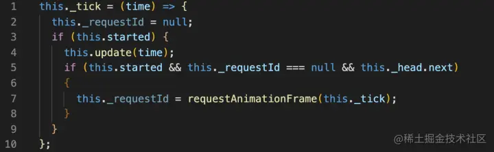 this._tick会不断被requestAnimationFrame调用执行,以实现loop的逻辑。但是循环开启有三个条件:this.started为真,this._requestId = null以及this._head.next存在,这三个条件是否都成立?